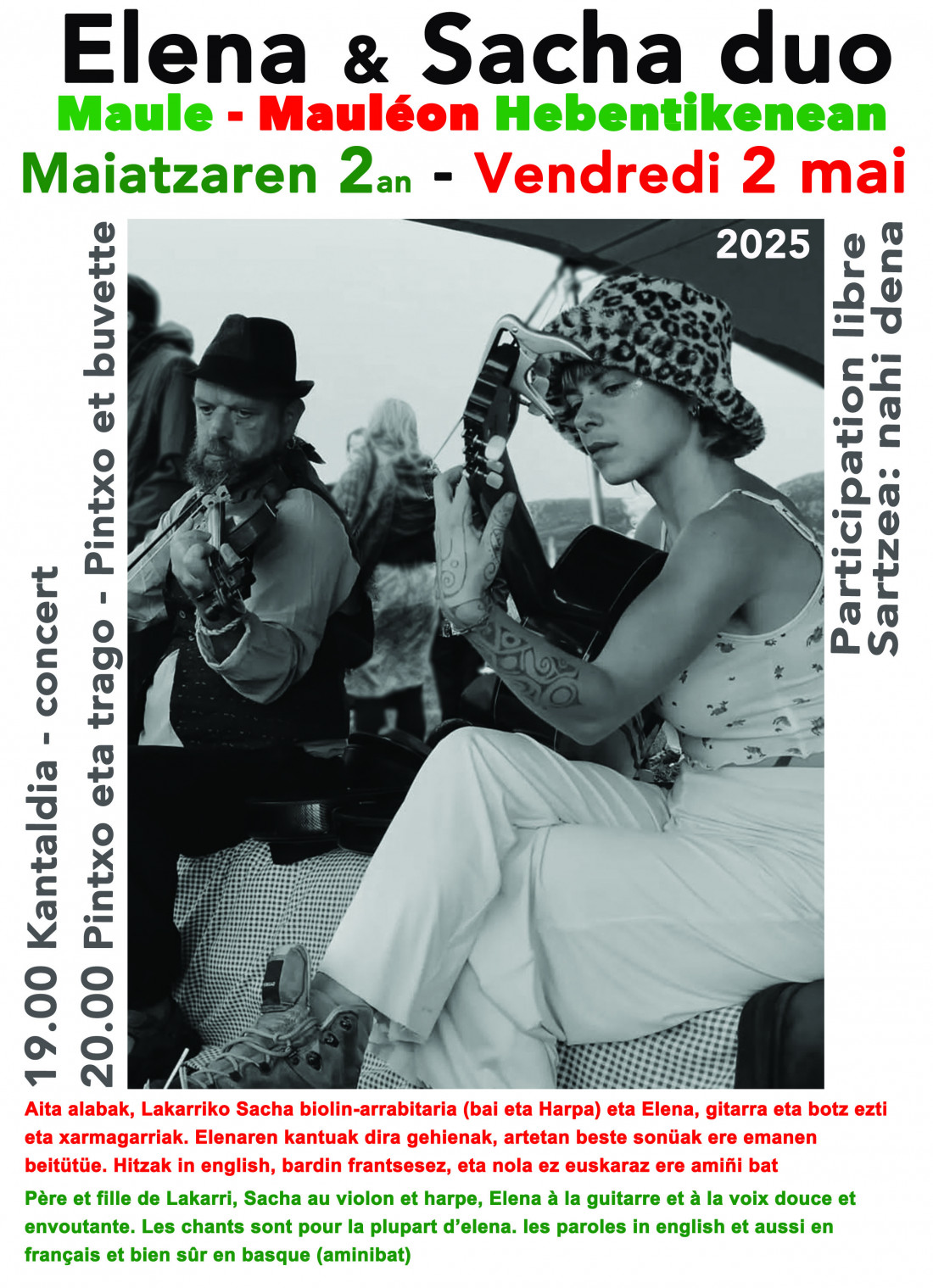 Aita alabak, Lakarriko Sacha biolin-arrabitaria (bai eta Harpa) eta Elena, gitarra eta botz ezti eta xarmagarriak. Elenaren kantuak dira gehienak, artetan beste sonüak ere emanen beitütüe. Hitzak in english, bardin frantsesez, eta nola ez euskaraz ere amiñi bat