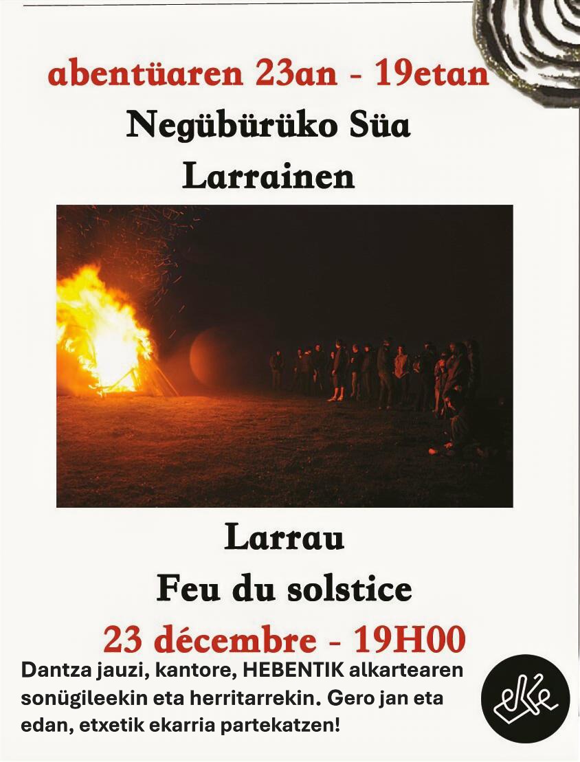 Neguburuko sua Larraineko Metropolisean Xiberoan Abentuaren 23an 19.00etan herriko plazan Non da Larraine? Gure munduaren erdigunean zuzen zuzen Maule eta Otsagabiaren artean zuzen zuzena! Hebentik (Xiberotik) abiatzeko auto partekatzea - 18.00 Gotaineko gelako aparkalekuan - 18.15 Atharratze posta gibeleko aparkalekuan "Kontrepasak hirur puntu arrabitan zurdetan..."