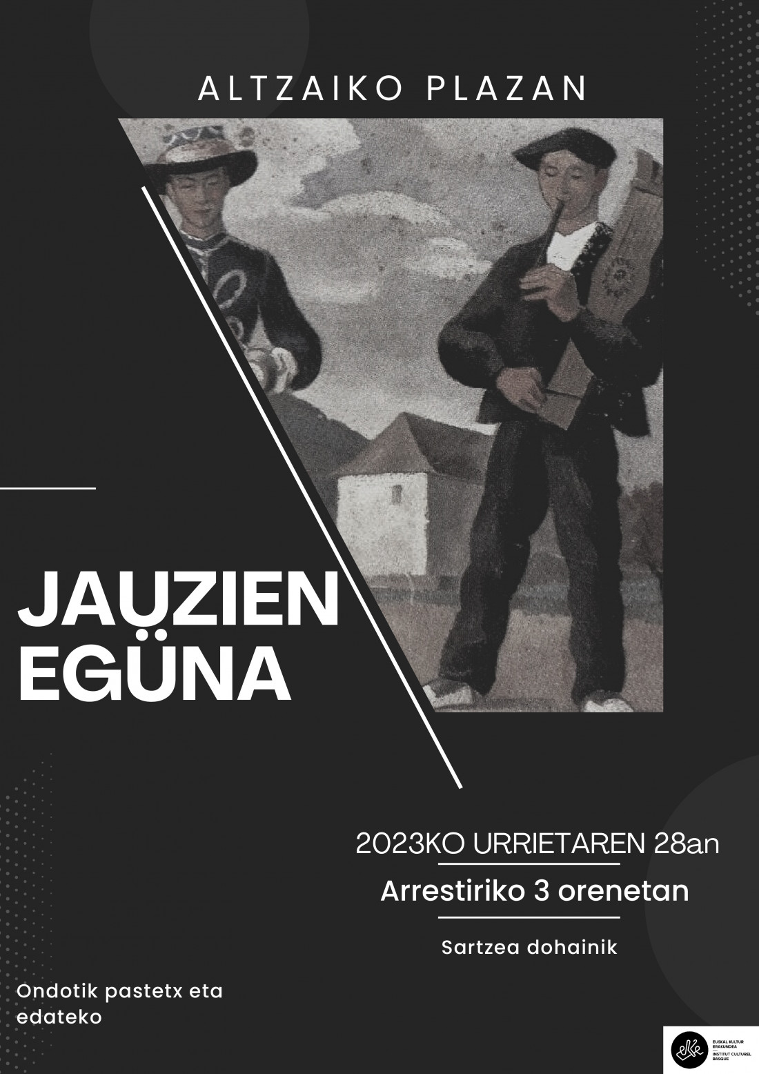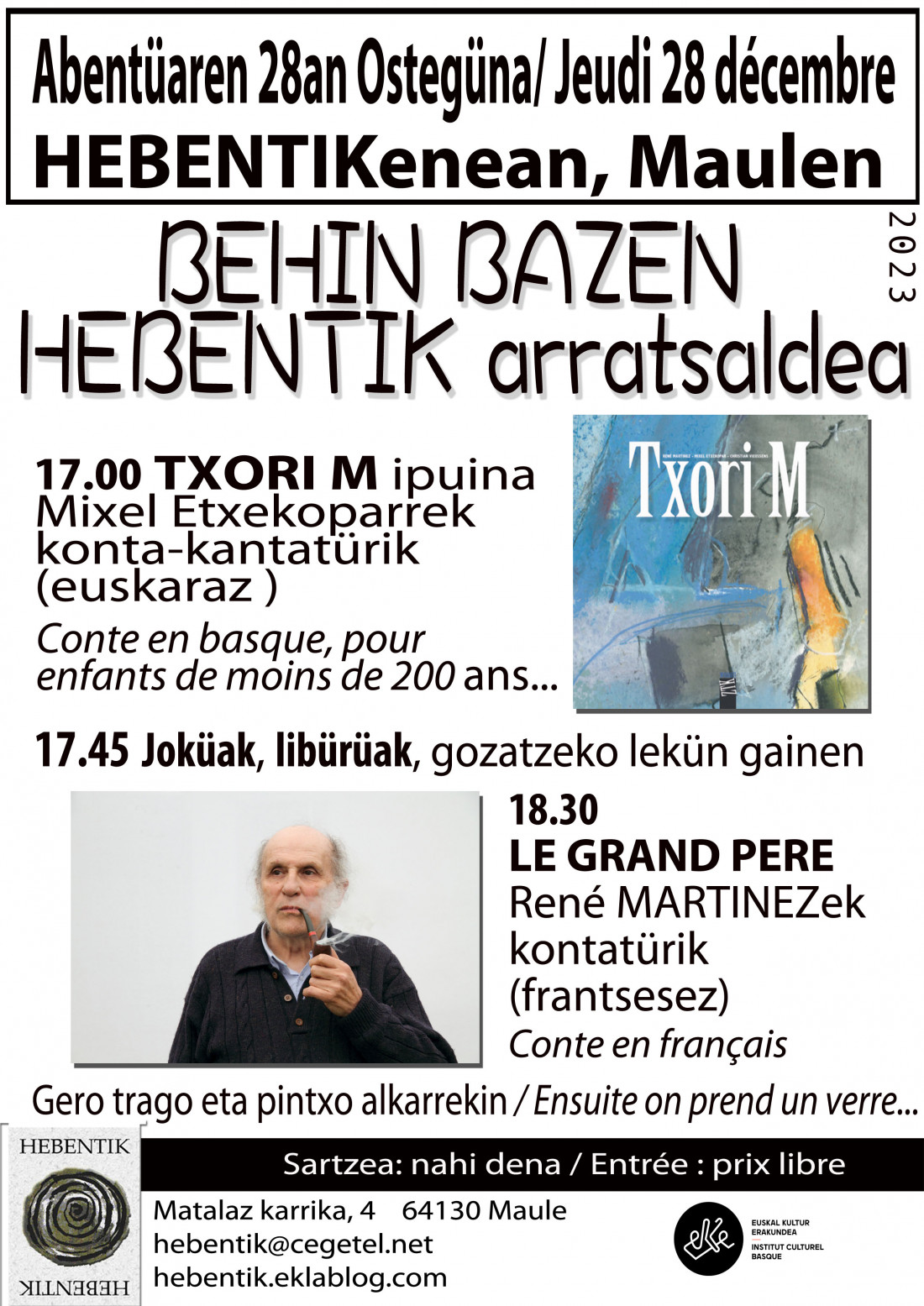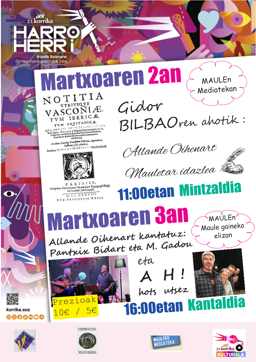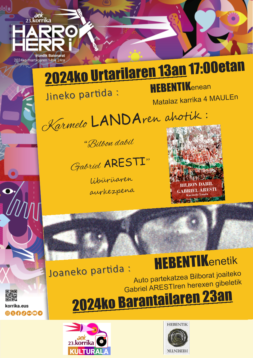 | MAULEN MARTXOAREN 2 eta 3an: ALLANDE OIHENART IDAZLE XIBEROTARRA (1592-1668) ITZULI DA! GIDOR BILBAO mintzo, PANTXIX BIDART eta A.H. talddea kantuz! XIT Taldea / XIBEROKO IRAKURLE TALDEA Maulen HEBENTIKENEAN 2024 / I / 13an "BILBON DABIL GABRIEL ARESTI" Karmelo Landa bizkaitarrak idatzi liburua Karmelo Landa idazlea taldeko kideekin.... XIT Xiberoko Irakurle Taldearen bilkura Gabriel Aresti bizkaitar poeta gogoan Karmelo Landaren liburu aurkezpena: JAUZIEN EGÜNA igaranik Sacha Standen-en Xiberoko dantzen partizione libürüa prestatzen ari Hona kümitü berri bat: Ttunttuneroen gizartea. XABIER ITZAINAren mintzaldia Abentüaren 2an neskenegüna 18.00etan Hebentikenean Maulen Ondotik trago bat alkarrekin Hitzaldia euskaraz iraganen da. Sartzea dohainik. Hitzaldi hortan aipatuko dugu Ipar Euskal Herriko soinulari edo soinü egileen historio soziala. Lehenagoko lekukotasunak eta artxibo materiala erabiliz, behatuko dugu denboran zehar nola beiratu eta/edo aldatuz joan diren soinu tresnak berak, soinularien betebeharrak bai eta soinulariek gizartean zuten tokia. Hitzaldiaren oinarri den ikerketa Lapurdi eta Baxenabarren eremana izanik ere, xiberutar adibide eta ikerbide zonbeit aipatuko ditugu bide nabar. X. ITZAINA Itsasuarra soinularia da bera, bai eta CNRS-an ikerlari da Sciences Po Bordeaux-ko Emile Durkheim zentroan. "La société du tambourin liburua atera berri du. JAUZIEN EGUNA 2023 Altzaiko plazan urrietaren 28an Argazkiak: JL Baffalio Udabruko bralea - Jondane Johane - Pagolako dantzariak Jauzien Egüna, hegoaren egüna! Aizea Xiberoan, aizea Altzaiko plazan, aizea nausi! Bena aizea ere txülüla ttun-ttun eta arrabitetan, hatsa hobeki erran, hats zahar bezain berria, zahar bezain gaztea. Eta hatsa behar zen bai hegoari bühürtzeko, bai eta jauzi horien bürüalat eramaiteko. Ez zen ikuskizun formala, ez zen dantzaldia, ez zen Ikea edo Carrefour-eko produktu enbalatüa, kontsumitzeko prest, kanpoko plastika ürratü, konektatu eta jaka zazu! Ez zen Bena ordüan zer zen ote? Bizi une eta güne bat, transmisio aldia, entsegü eta emaitza batetan, freskotasun honartüak berotürik, gazteak eta gazte izanak nahasirik, "aritegi bat aire librean arigia bizi batetan Dantza plazan hots! Badea plaza beno leku hoberik herri hontan agertzeko? Badea leku hoberik hurean beno igerixkan trebatzeko? Gure Beñat Larroriren kobla zonbait dantzen presentatzeko eta Aitzina (pika!) "Gure hitzak erran berriz erran / ez daitezela ahaztu ez daitezela gal / elur gainean txori hanka arinek / utzitako arrasto sail ederra bezalaxe / Txorittoa norat hoa / bi hegalez airean Bernardo Atxaga idazlearen hitzak xuxen dira gure eüskararentako, haatik xuxen ere gure kantoreen, eta halaber gure dantza jauzientako! Eta jauzien kasüan bürüak bere memoria balinbadü zankoek ere hala hala behar düe. Hortaz ohartu gira, bai dantza berrietan, bena "zahar-berritüetan ere! Zonbat nahi entzünik ere Mutxikoak, Lapurtar motxak, Baztandarrak, Xibandriak, zankoetan ere sarrarazi behar düe nahi ala ez! Zankoek ez badakie zer jiten den, sinple lauetan edo ebats, pika, beharriek ez badüe hein batetan asmatzen zer ahaire den jitekoa Ordüan ü... ü...üko egiten düe, eta saldoak, biribilak ezin dezake bere hoberena eman! Millagateko harrespilletako harriek ez düe alkarri eskurik emaiten, bena lürrak bai lotzen dutu. Jauzietan ere hala. Altzaiko entsegü-mustraka hortan, ber manerala, hortaz ohartü gira denak, eta bakotxa ere. jauzi biribil batetan dantzaria bere bakartarzünean osotarzünaren parte dela, bizian bezala funtsean! Sinple lauetan bezain sinple üdüri ere, biribil horrek badütüala bere kanttuak, orotan bezala, eta trebatü beharra! Baztandarren kasüan, zazpi minuta igaranik, hogeita zazpi aire desbardin, dozena bat ürrats edo konbinazio zankoek eta bürüak bat egin behar. Eta bihotzak. Zeren maite ez dena nekez baizik ez beigenezake ezagüt Arrastiri aizetsü hortan ageri zen dantzari maitarzüna bizi dela düda gabe. Braleen aldia: lau brale, lau kantore, lau dantza kantatü, lau sasu, lau urtaroer eskeinirik. Kantatzeak berea balinbadu jauzietan, ürratsen markatzeko, dantzaren ikasteko, lau brale edo soka dantza horietan aldiz dantzaren parte da, botzak, sokak eta zankoak korpitz bakotxa eginez. Larrazken eta bedatseko braleentako lehen agerraldietarik zen neskenegun hartan, beste biak jada sartüak direnean üda eta negüko süen üngürüan Larrazkeneko bralea - Barkoxeko dantzariak Dantzak zonbait ziren ikus-ikastekoak, bereziki berriak, edo Xiberoan gütiago erabiliak (Mutxikoak haietan dütügü bitxiki, hain ezagütüak direnean Iparraldean eta Biarnoan ere!). Herri bakotxak egin ahala egin züan horien ejerki ikasteko eta prestatzeko. Segür ikusle hanitx bazen barandan dantzan sartzeko, bena parada emanik izan zaie gure errepertorioko oraiko "estandarren emaiteko, eta plaza ordüan ttipiegi agitzen zen hainbeste zankoen edeiteko! Eta gero zer? Gero hotz ez dena beti bero! Jauzien egüna lehen ere izan zen lau bost aldiz (igaran mente ondarrean!), ordüan bardin berriz egin, plazak ez dira eskaz! Hartarako gogoa bada let’s go-azen! Eta beste okasionetan ere sartü, zergatik ez herriko bestan, jauziak edo brale aldi bat prestatüz, haietarik zonbait haütatüz, musika zuzenean, dantzariak üngürüan, aitzinetik trebatüz halere, gogoa eta zankoak ontsa josteko! "Zin aitzina aitzina pika /Jauzien ondoan zinka Aitzindarien argiak / Orhi tinia killika Izan ontsa berriz arte / berriz ontsa izan arte laster gira gütan fida / jüntatuko lagün maite Irabarneko aize epailea Mixel Etxekopar 2023 / X / 30ean Xibandriak - Atharratzeko dantzariak Dantzariak: Hamabi herri edo hobeki erran dantza eskola ziren ageri, haietan 130 dantzari: Pagola, Muskildi, Urdiñarbe, Maule, Ezpeize eta Pettarra, Sohüta eta aüzoak, Barkoxe, Zalgize Iruri, Atharratze, Ligi eta aüzoak, Larraine, eta prefosta Altzai! Txülülari - ttunttunlariak: Naia eta Cleo Ager, Argi Barretx-Othatzegi, Mirentxu Lako, Frantxoa Xab