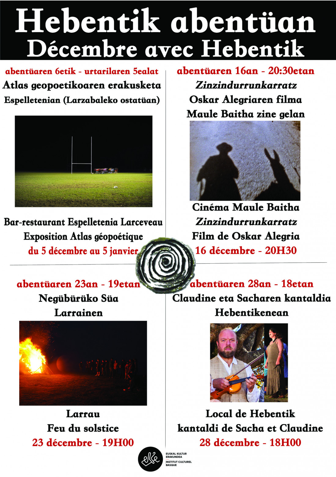 Erakusketa bat Lartzabalen, filma bat Maulen, Negüko süa Larrainen eta Kontzertü bat Hebentikenean